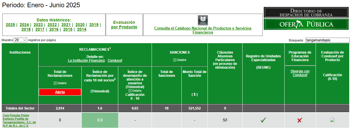 Podrás consultar la información que consta de Caja Popular Padre Epifanio Padilla de Tangamandapio S.C. de A.P. de R.L. de C.V, en el Buró de Entidades Financieras a través del siguiente link: "http://www.buro.gob.mx/BuroSector.php?Sector=29"
