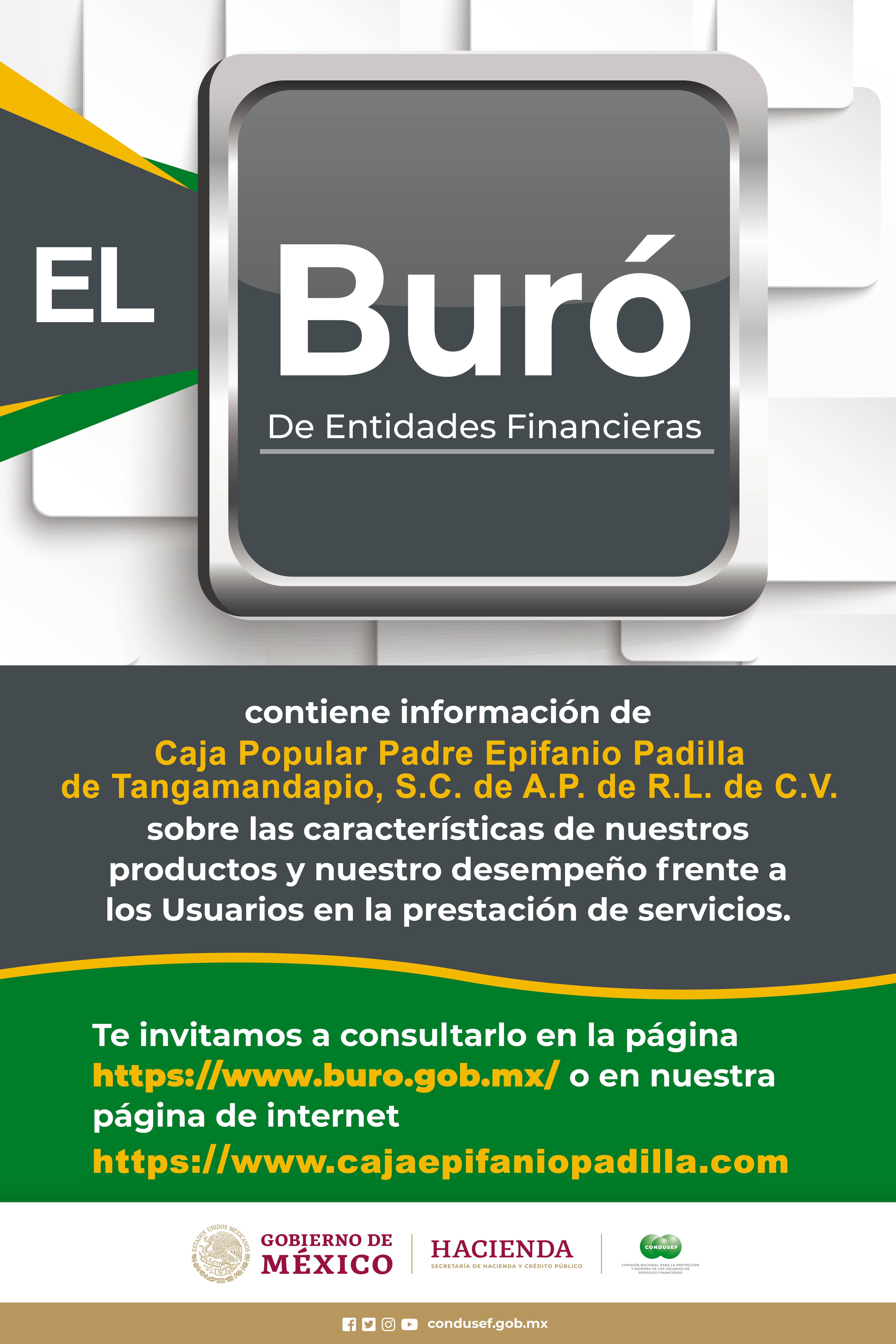 Podrás consultar la información que consta de Caja Popular Padre Epifanio Padilla de Tangamandapio S.C. de A.P. de R.L. de C.V, en el Buró de Entidades Financieras a través del siguiente link: "http://www.buro.gob.mx/BuroSector.php?Sector=29"